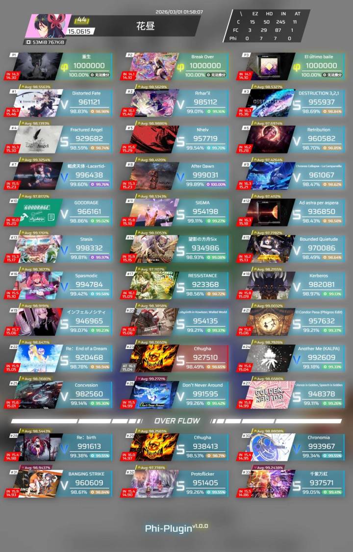 规则: 看到加载界面是什么曲绘就打什么歌⊙▽⊙ 优先级为IN,刷到第二次则选择AT^_^)Y 初始HP:15当HP≤0时,判定为游戏失败 当HP≥30时,判定为游戏胜利^_^)Y 奖惩机制: 爆miss/bad时,HP-1FC: 14-14.9 (HP+1),15-15.5 (HP+2.5),15.6-15.8 (HP+3.5),15.9-16.3 (HP+5),16.4-16.7