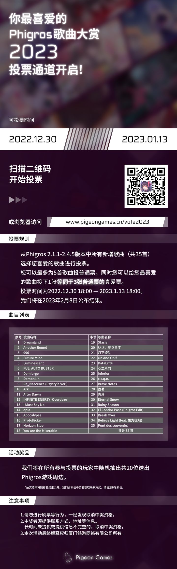 咕咕咕!2023“Phigros你最喜欢的歌曲投票”活动来啦!参与就有机会赢取周边礼品哦!快来为你喜欢的歌曲投票吧!投票通道:注意:本次投票包含的歌曲仅包含2.1.1至2.4.5版本 中更新的所有乐曲。