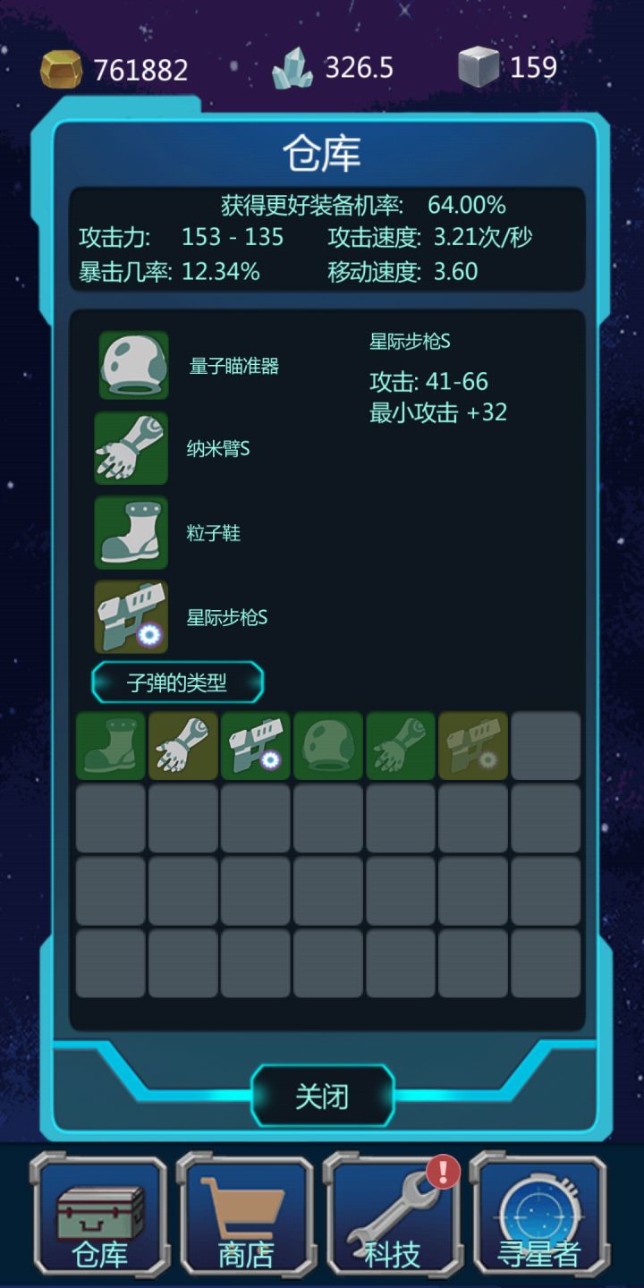 更新内容 :1.子弹种类增加到10种。(子弹绑定枪)2.成就系统,任务系统。3.星图显示所有有资源的区域。(不用再瞎逛了。。)4.显示真实出彩色装备几率。(暴击几率也改成了显示最终加成。)5.战斗操作方式变了,现在可滑动滑竿左右移动。(更适合单手游戏)6. 可以看广告了。。。(无自动弹出,都需要自行手动点击观看)