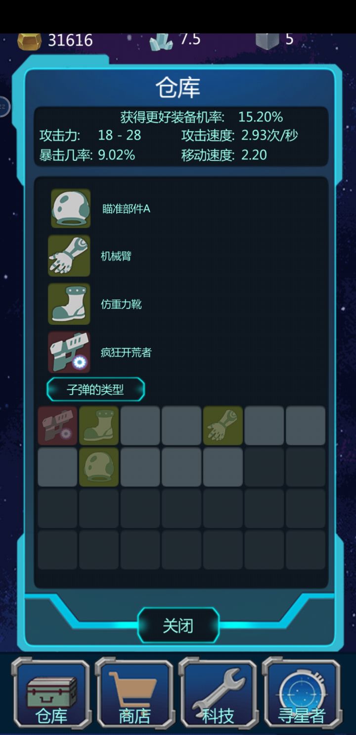 更新内容 :1.子弹种类增加到10种。(子弹绑定枪)2.成就系统,任务系统。3.星图显示所有有资源的区域。(不用再瞎逛了。。)4.显示真实出彩色装备几率。(暴击几率也改成了显示最终加成。)5.战斗操作方式变了,现在可滑动滑竿左右移动。(更适合单手游戏)6. 可以看广告了。。。(无自动弹出,都需要自行手动点击观看)