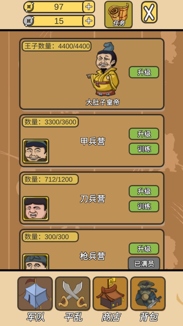 这是一个养成类策略游戏,点击皇上可以生下王子,建造各种兵营之后,可以把王子训练成各种士兵,然后帮助皇上去平定天下。