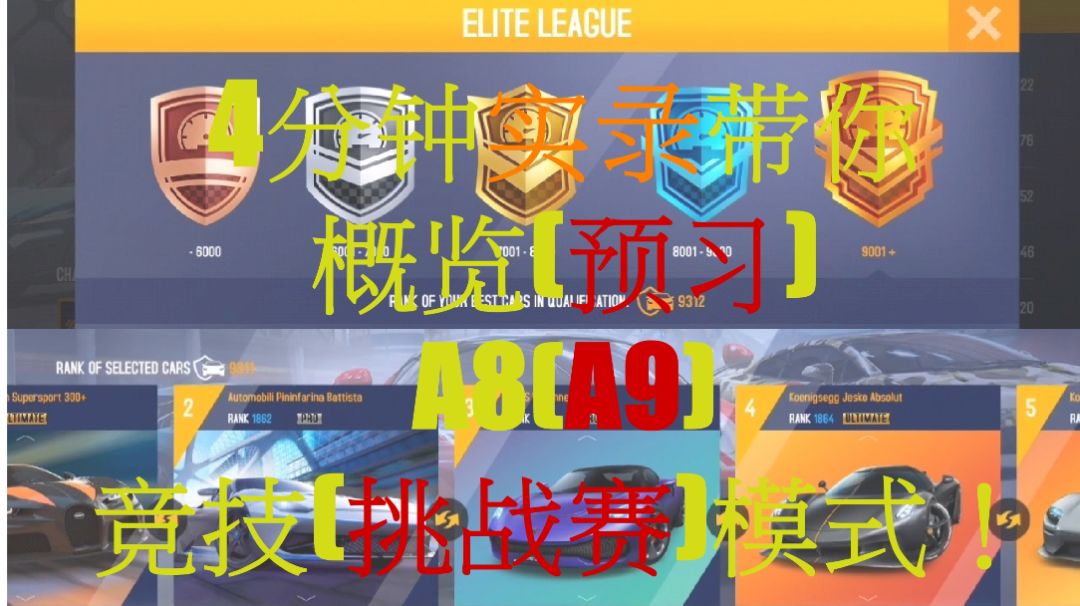 首先,A9擂台挑战赛并没有接力赛,图内玩法类似于Clash(但是短图),图外玩法/机制就是A8的竞技模式: 系统依据你车库最高性能分的5辆车给玩家自动划分等级,无车辆使用限制。 玩家个人随机分配到5个图(大概因为没有5车接力模式,所以改为5张图),防守(刷图上传成绩)--进攻(依据当前分数匹配对手,推图结算分数&拿商店货币) 和A8竞技一样,每周结算,按排名发放奖励 其次,挑战赛不按成绩分组,基本