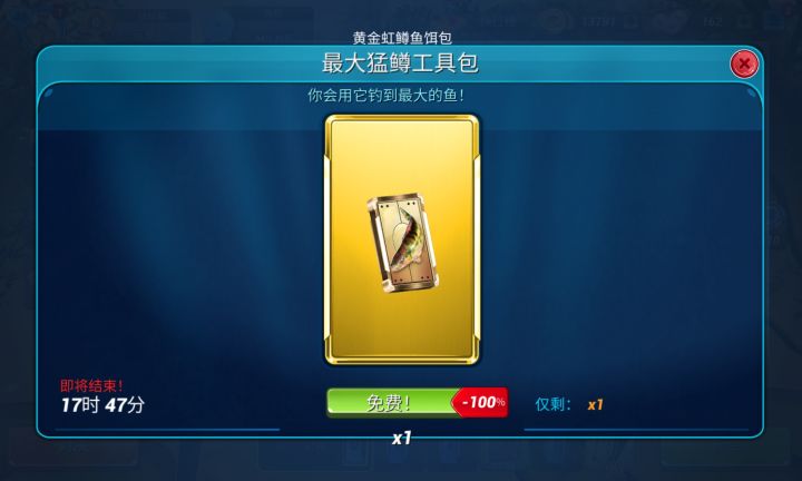 还没领这个的小伙伴抓紧了,今天上限免费给一个。反正是白嫖的,明天就没了。这个反正鱼儿不多,但是给我这号上了一级黄金红鳟鱼,也挺稀有的吧。