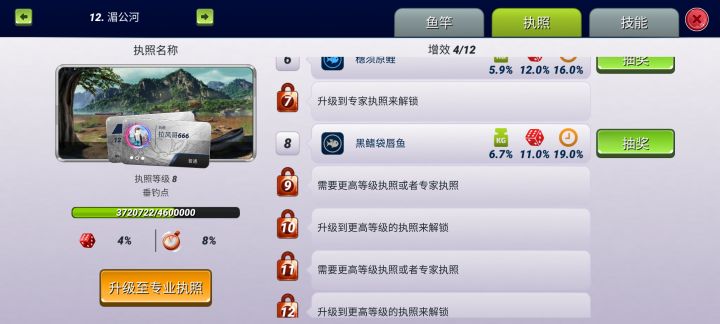 有的时候没有执照真的好难受啊,假如钓的鱼种少的话,还可以临时刷刷属性改一下,但是一场活动钓的鱼种多的话,想改都没几条属性改。看看我这执照,一共开了没几条,连个史诗的属性都没有,做起活动来真的和别人差不少,哎!看来珍珠还要再攒些,把执照升了再说。