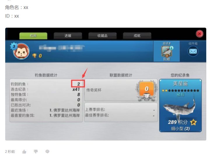 将你档案中的“钓鱼数据统计”展示给大家,比一比谁才是《钓鱼大对决》里的水产大亨!活动时间:9月12日23:59截止活动规则:1.按照回复格式(见图1处),前往角色面板进行截图,附带自己的游戏内昵称及游戏ID(主界面-右上角菜单-设置),在此帖下进行回复,即代表本次活动参与成功;2.活动结束后官方将会收集本帖下大家的“钓到的鱼”的数量进行奖励排名,活动截止日期后回复的截图将视为参与活动失败,