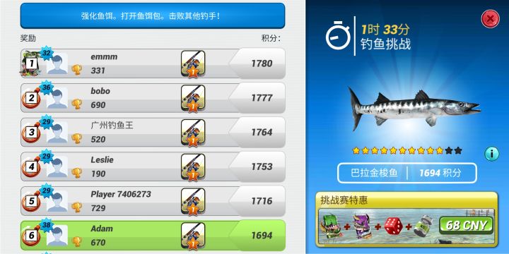 看到有帖子说不氪金十次九输,我想说那只能说明你脸黑。本人目前氪了68块,买了一、二级渔场的高级执照。鱼饵来源主要靠参与活动。截止发贴时,目前的锦标赛排名是第三,挑战排名第六:另外钓起过魔王鱼共五条:给大家的建议就是,金币是有限的,专注于一个渔场比多线作战更有效率。由于目前的活动都是出在佛罗里达(一级渔场),所以只升级一级渔场的饵是比较有效率的。