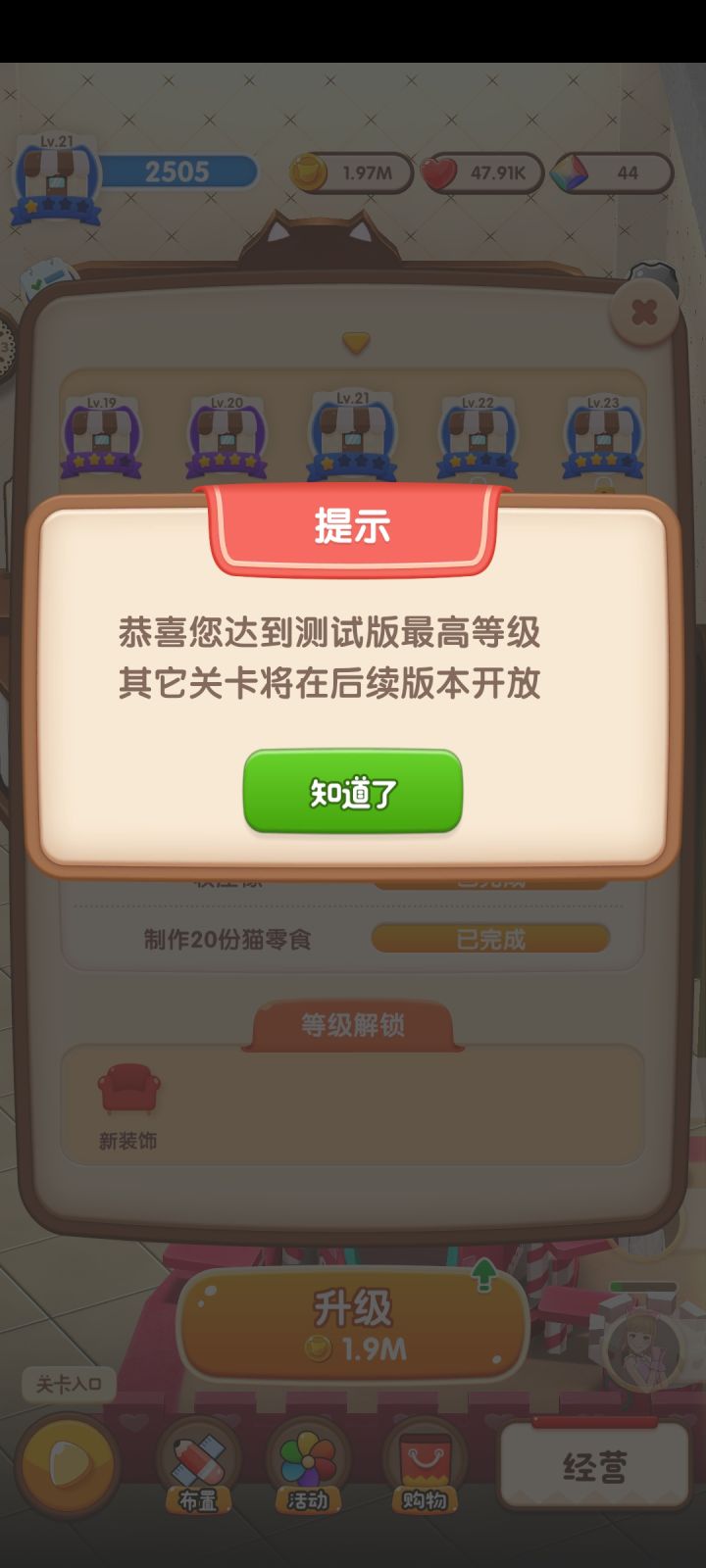 满级了,所有关卡都过了,发现三个bug。第一个是第二个图,还差一个冰块没有消,用了几个跟踪那个也炸不出来,遇到一次。第二个就是突然不能移动了,一共出现过两次。第三个是离线奖励只能用免广告卡翻倍,没卡了点看广告没反应。总体来说还是比较好玩的,但是跟1的玩法完全算两个游戏了吧。另外能不能把1的猫咪继承给我几只呢😁