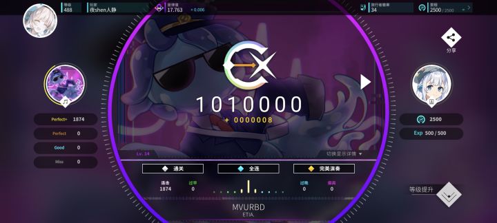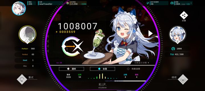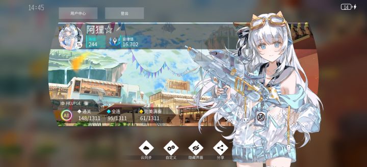 首先这个游戏我很早之前就下载过了(大概是在2025年6月份左右),当时是因为玩音游半年了,对音游很感兴趣,但是一个游戏一直玩,肯定也会腻的,之后就在 tap音游排行榜 上看看,有没有其他好玩的音游,结果就看到了这个,之前在哔哩哔哩也看到过这个游戏,所以顿时就来了兴趣。 我上游戏第一件事就是看看游戏主页整体设计,之后就毫不犹豫的点开 开始游戏,打了比较低等级的 1-3难度 ,熟悉游戏按键和玩法机制,因为觉得这个游戏玩法还可以,所以 就算 之后没有点开这个游戏玩的意愿,也还是没有把游戏删掉。 我花了三个多小时,完全熟练了按键,如下图所示,这是我打的战绩,敢相信?我玩这个游戏没有玩到一个小时就氪了金,挑了两个我想买的曲包,分别是音乐世界赛特斯(Cy)联动和游戏本家的曲包,音乐世界赛特斯玩过,所以这个曲包不用多说,不过本家游戏的曲包也非常可以,下面打的战绩我都是按照节奏和音律打的,越打越舒服,越打越流畅,这个游戏里面设计的元素很丰富,角色的设计也很丰富,特别是角色立绘,还有人设 。诶!!你还别说,这个游戏每全连一首曲的任意难度,都会送一个头像哦(≧▽≦)~~~头像就是这首歌的曲绘,买曲包也会送主题背景和个人主页背景,这方面做的算是很到位了(๑>ڡ<)☆