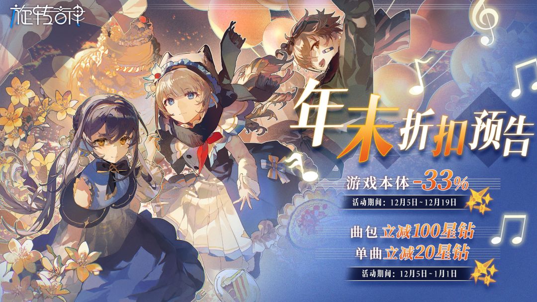 亲爱的驾驶员,12月5日至1月1日,《旋转音律》游戏本体与游戏内曲包将进行限时折扣活动。 ・游戏本体 -33%(折后12) 活动期间:12月5日 ~ 12月19日 ・游戏内曲包立减100星钻,全单曲 -20% 活动期间:12月5日~1月1日