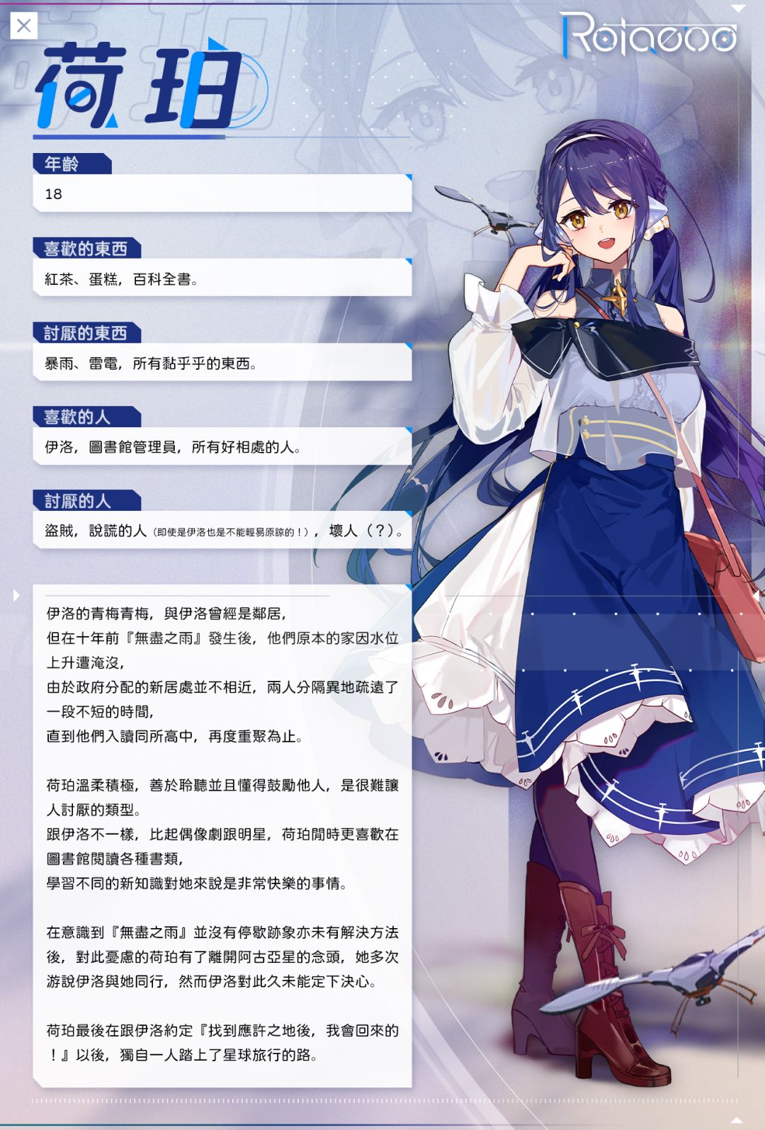 角色介绍——荷珀 「我一定會找到應許之地的!」 有言道人無完人,但荷珀便是集才華和勤奮於一體的例外。 無盡之雨降下後,她奔波於研究室與圖書館,試圖尋找無盡之雨形成的原因。在留下自己要前往應許之地的訊息後,告別伊洛,離開了阿古亞。 應許之地,到底隱藏了什麼祕密?