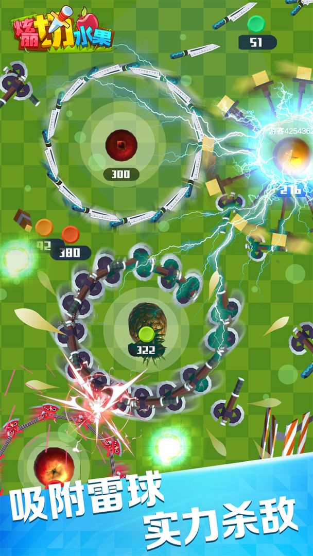 《绚丽切水果》不同于常规的切水果游戏,这是一款操纵水果吸附周围零散的飞刀形成自己的飞刀防护壁,吸附的飞刀越多,飞速旋转的刀环的攻击力就越强,击溃其他水果的防御,获得爆切水果的快感!在享受切爆美味多汁水果的爽快手感的基础上,加上吞噬元素,与其他游客进行飞刀竞技对抗!游戏中设有多种障碍道具,会剥离你的飞刀防护壁,一定要小心哦!除此之外,游戏中还可以排位和组队,你不仅可以享受制霸排位榜的王之蔑视,还可以与队友并肩作战,切爆对面小苹果!
