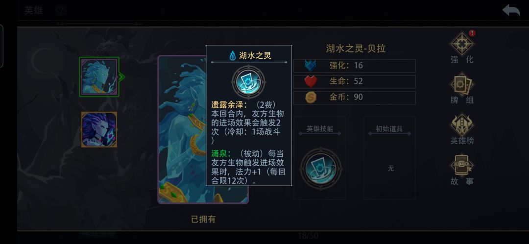 湖水之灵只是可以更好的实现永动机其他水系英雄也可以实现永动机 具体玩法 1.计算好法力值 2.海潮涌动本回合加法力值 3.法力潮汐下回合加法力值 4.用主动技能 5.上蓝龙,再给蓝龙心灵回响刷法力值 6.贝灵之光过牌,刷心灵回响 7.最后上主C,再给主C加攻击力 极简卡组 心灵回响1张,蓝龙1张,虚空构造体1张,灵贝之光1张,法力潮汐1张,魔力浮龙1张 精致卡组 心灵回响1张,蓝龙1张,虚空构造体