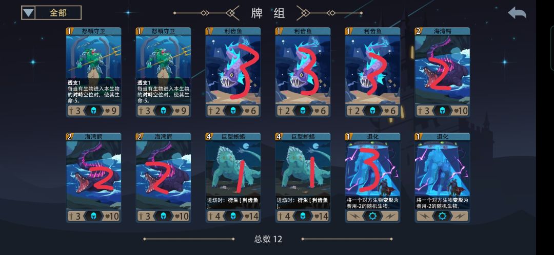 开局一直闯随机事件,多删高费牌,除了核心牌,不要乱拿牌 打法思路 利用鱼上鱼的肾透支被动,每次肾透支获得一点法力值,进行快速铺场 优先固有牌 怒鳞守卫2张,长鳍智者1张,潮行鱼人1张,海潮涌动1张 小技巧 1.法力足够的情况下要先放潮行鱼人 2.C被对面挡住了用暗潮灵活换位 3.在上了潮行鱼人后,用旋风把己方的怒鳞守卫,不停回手再打出攒肾透支叠伤害 4.用旋风回手对面的C位 5.用了鱼上鱼的主动技