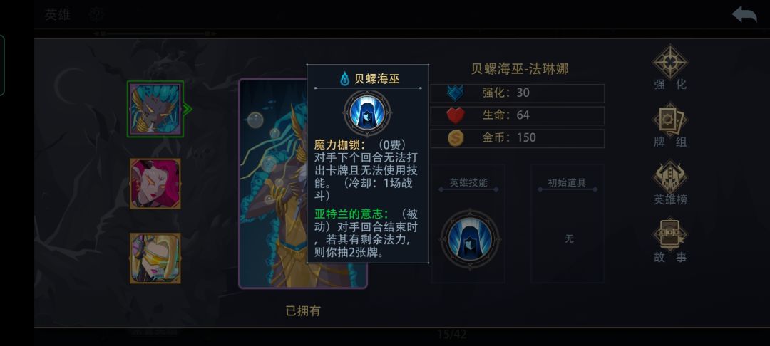 算是水系比较好用的英雄之一了,强制控场还能顺便拉牌差 飓风魔偶:核心,碰见就抓,有几张抓几张 虚空构造体:飓风魔偶数量不够时下位代替 虎斑贝勇士,灵贝之光:稳定过牌,用于提高飓风魔偶的攻击 心灵回响:1费回手加过牌,性价比远超旋风 蟹螯:碰见就抓,防止虎斑贝无法打脸 其他的有很多是可以代替的就不发了 讲一下打法: 首先要保证起手有虎斑贝勇士,和法力透支,这两张固有即可,飓风魔偶不需要固有,因为虎斑
