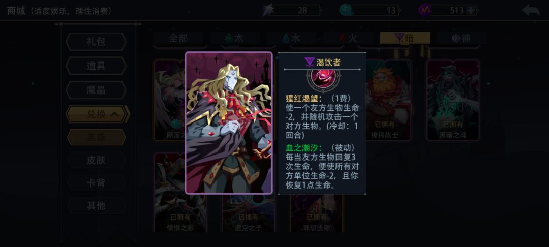 最近在玩暗系英雄,当然,我是比较菜的,只是附上我对暗系英雄渴饮者塞巴斯蒂安的一些想法,有错请轻喷。 主动技能是使一只友方生物生命-2随机攻击对方生物(对方无生物的情况下也-2但不会攻击对方单位),一回合使用一次,21级后使用0费 被动技能是友方生物每回复三次血,使敌方所有单位生命-2,你的生命+1,重点是无CD ———————————————————— 很显然,这英雄有续航,就是拖后期的 我认为他
