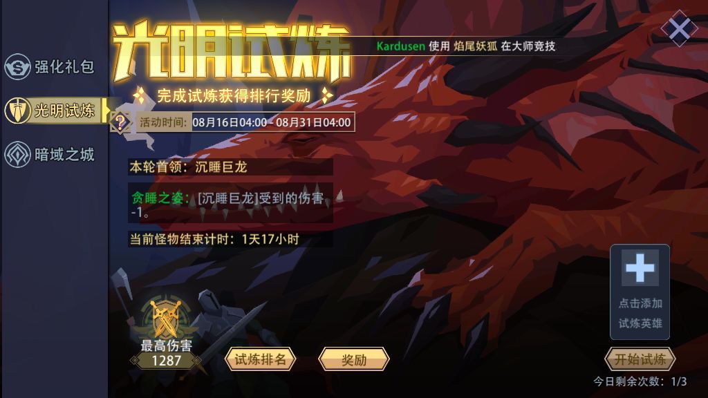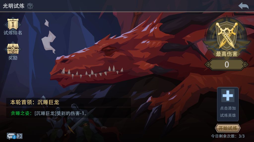 BOSS介绍:沉睡巨龙 技能介绍:如下图 强化技能介绍(打掉150血后):真实视界 Boss卡组介绍:主要注意下暴风雪(一张),多会在我方打掉150血后的boss二阶段下一回合使用 当日可选英雄: 英雄推荐: (1)生命之刃(主要推荐) 卡组思路推荐:秘法比蒙透骨流或三尾蝎成长流搭配蘑菇补血流 秘法比蒙透骨流:需要卡牌:秘法比蒙、月魂秘术(比蒙幼崽、比蒙等) 蘑菇补血流:(孢子+树妖+低语者+生命
