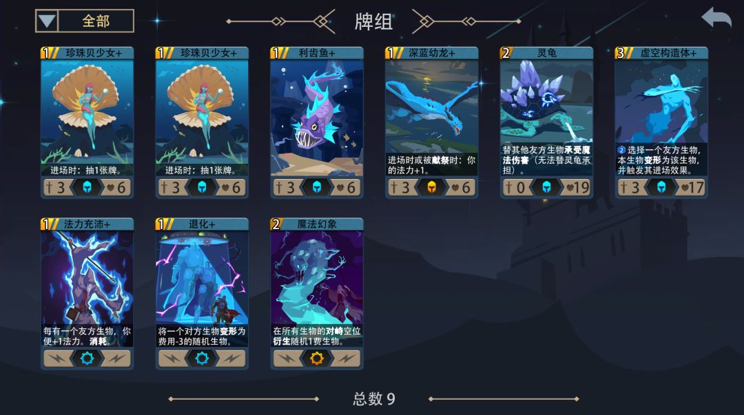 牌库数量:9~10张 卡组构成:4张1费,1张2费,1张魔法幻象(必备) 1费生物中有深蓝幼龙+时再加1张法力充沛即可 .操作步骤为:献祭深蓝幼龙+,上场珍珠贝少女×2把深蓝幼龙+再抽回来,上场深蓝幼龙+,上场另一张1费,使用法力充沛,上场2费,使用魔法幻象(上场生物要和对方暗影魔对位错开) 无深蓝幼龙+时可换成1张海潮涌动+或法力潮汐+ 天赋优先第3行 英雄最好26~30,卡背随意,英魂