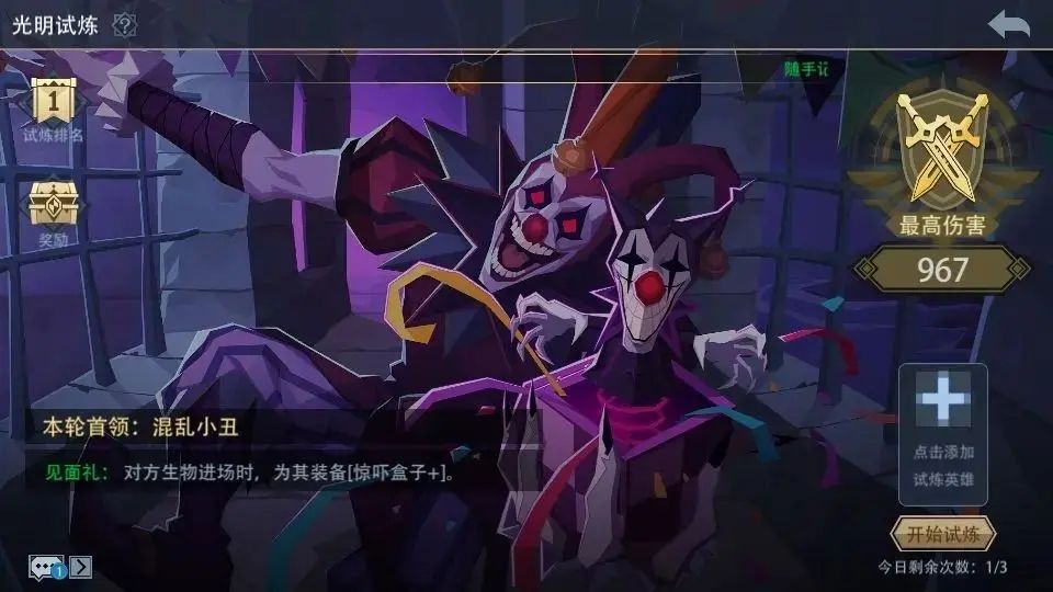 BOSS介绍:混乱小丑 技能介绍:见面礼 强化技能介绍(打掉150血后):混乱狂笑 Boss卡组介绍:(开局手牌有固有装备毒物喷射器,注意连锁闪电) 当日可选英雄: 英雄推荐: (1)生命之刃 卡组思路推荐:三尾蝎成长流搭配蘑菇补血流(最佳组合搭配) 蘑菇补血流:(孢子+树妖+低语者+生命古树+治愈之风等)该常规打法一般可以拿满魔晶奖励,2000分伤害打满需要的条件较高。 三尾蝎成长流:需要卡牌: