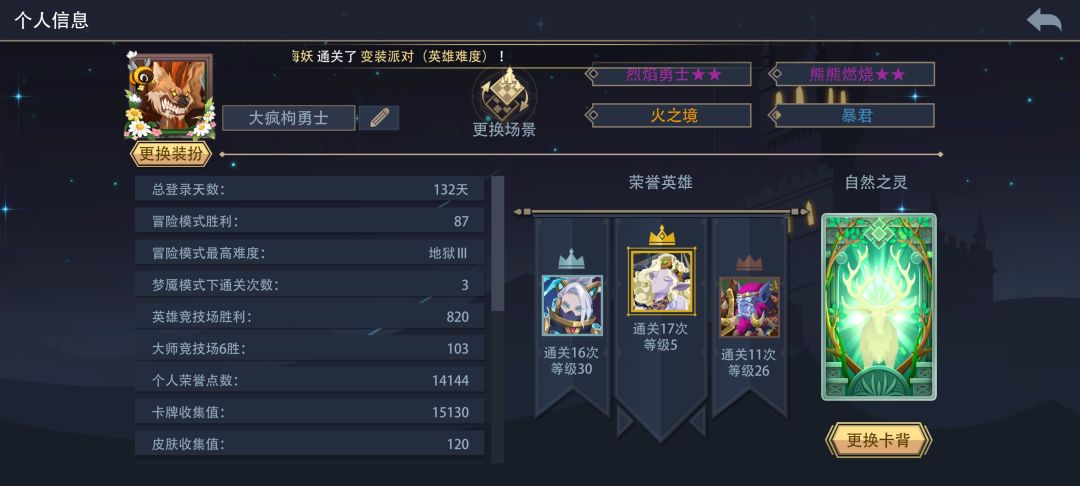 BOSS介绍:火焰之灵 技能介绍:如下图 强化技能介绍(打掉150血后):如下图注意点:打掉150血后我方出牌越多死的越快 Boss卡组介绍:如下图(注意咒焰风暴、连锁闪电) 当日可选英雄: 英雄推荐: (1)雪月妖狐(前期跳高费) 卡组思路推荐:三尾蝎成长流搭配蘑菇补血流 蘑菇补血流:(孢子+树妖+低语者+生命古树+治愈之风等)该常规打法一般可以拿满魔晶奖励,2000分伤害打满需要的条件较高。 三