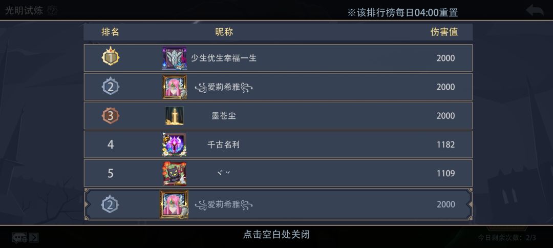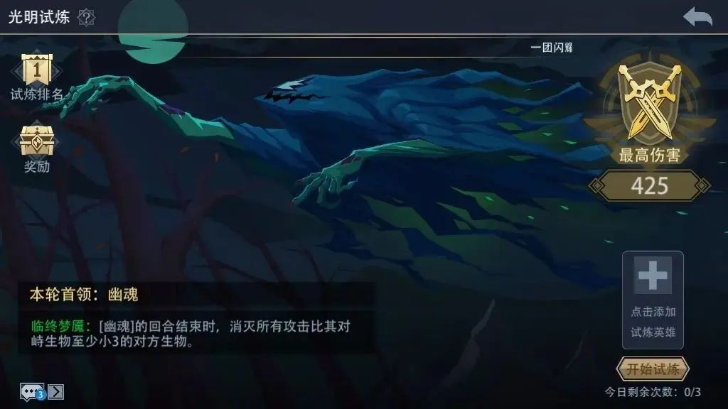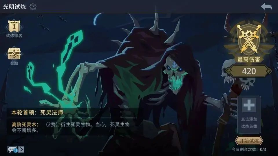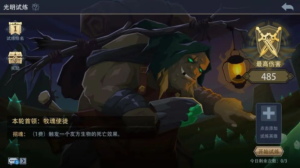 BOSS介绍:死神 技能介绍:如下图 强化技能介绍(打掉150血后):如下图(注意打掉150血时我方英雄血量不能为我方场上血量最低单位) Boss卡组介绍:如下图 当日可选英雄: 英雄推荐: (1)林荫使者(连击加攻) 卡组思路推荐:三尾蝎成长流搭配蘑菇补血流 蘑菇补血流:(孢子+树妖+低语者+生命古树+治愈之风等)该常规打法一般可以拿满魔晶奖励,2000分伤害打满需要的条件较高。 三尾蝎成长流: