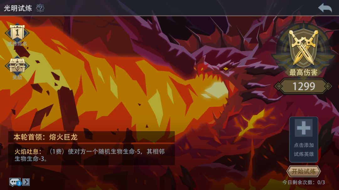 BOSS介绍:熔火巨龙 技能介绍:火焰吐息 强化技能介绍(打掉150血后):火种 Boss卡组介绍:(开局手牌有原生装备,可以带张拆装备的,注意小红龙法伤和红龙直伤) 当日可选英雄: 英雄推荐: (1)侠盗(击杀抽牌) 卡组思路推荐:三尾蝎成长流搭配蘑菇补血流 蘑菇补血流:(孢子+树妖+低语者+生命古树+治愈之风等)该常规打法一般可以拿满魔晶奖励,2000分伤害打满需要的条件较高。 三尾蝎成长流: