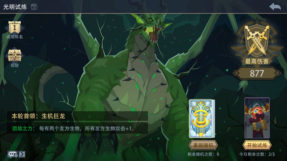 BOSS介绍:生机巨龙 技能介绍:团结之力(详情见下图) 强化技能介绍(打掉150血后):无限生机:(0费)随机使一个友方单位发动攻击 Boss卡组介绍:如下图 当日可选英雄: 英雄推荐: (1)铜锤萨满(光明试炼木系真神) 卡组思路推荐:三尾蝎成长流搭配蘑菇补血流(最佳组合搭配) 蘑菇补血流:(孢子+树妖+低语者+生命古树+治愈之风等)该常规打法一般可以拿满魔晶奖励,2000分伤害打满需要的条件