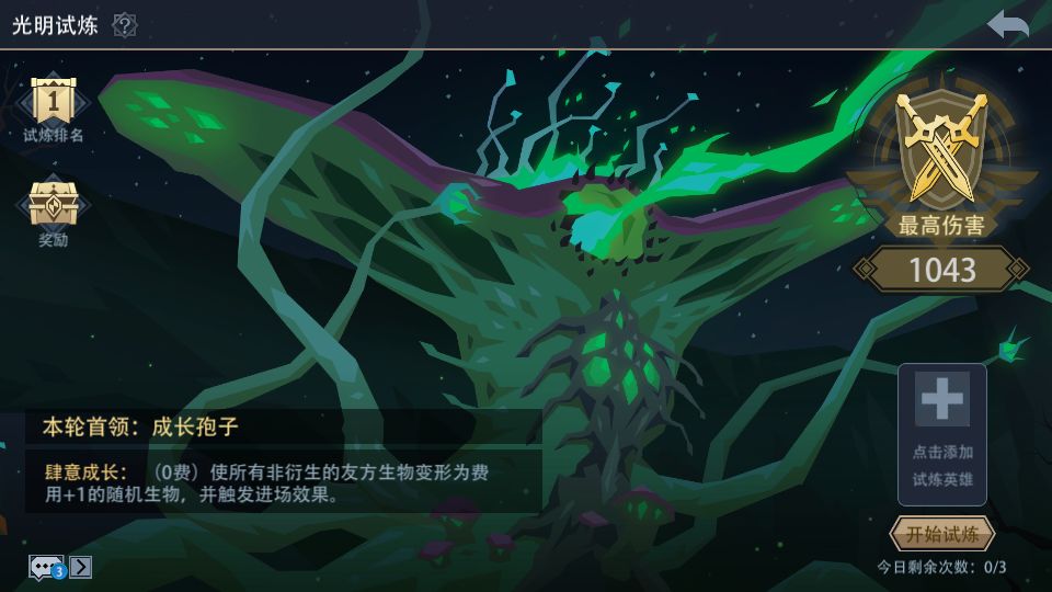 首领介绍:成长孢子 技能介绍:肆意成长(详情见下图) 强化技能介绍(打掉150血后):汲取营养,友方所有衍生生物攻击+3 Boss卡组介绍:如下图 当日可选英雄: 英雄推荐: (1)林荫使者 卡组思路推荐:三尾蝎成长流搭配蘑菇补血流 蘑菇补血流:(孢子+树妖+低语者+生命古树+治愈之风等)该常规打法一般可以拿满魔晶奖励,2000分伤害打满需要的条件较高。 三尾蝎成长流:需要卡牌:魔法孢子、低语者、