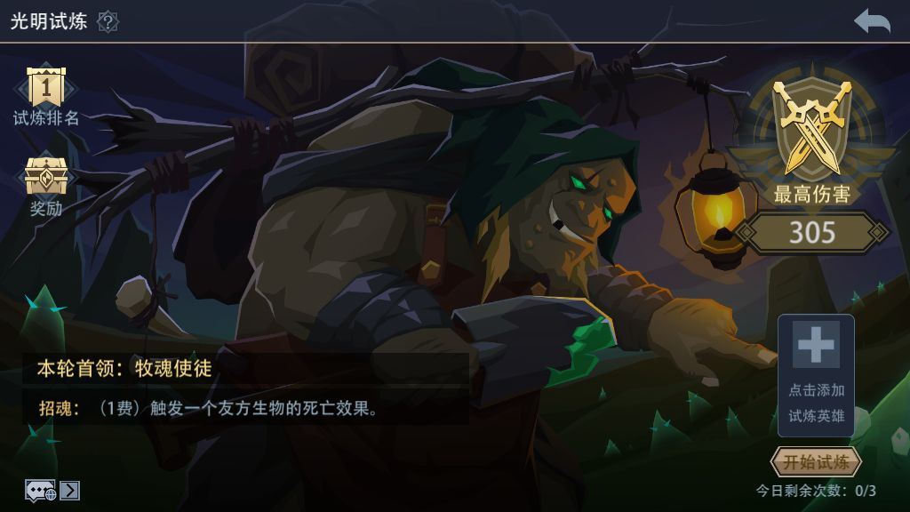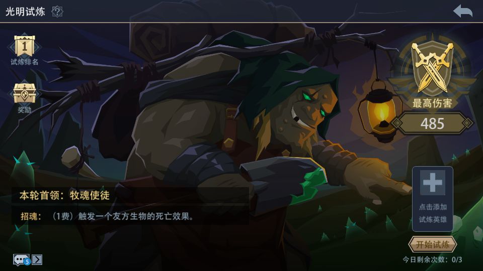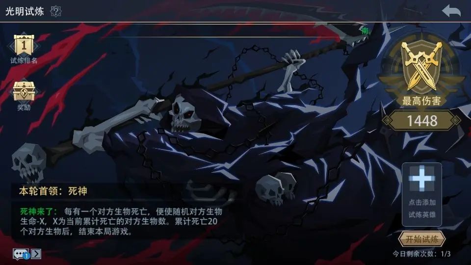 BOSS介绍:死神 技能介绍:如下图 强化技能介绍(打掉150血后):如下图(注意打掉150血时我方英雄血量不能为我方场上血量最低单位) Boss卡组介绍:如下图 当日可选英雄: 英雄推荐: (1)森之莹或狼魂少女 卡组思路推荐:三尾蝎成长流搭配蘑菇补血流 蘑菇补血流:(孢子+树妖+低语者+生命古树+治愈之风等)该常规打法一般可以拿满魔晶奖励,2000分伤害打满需要的条件较高。 三尾蝎成长流:需要