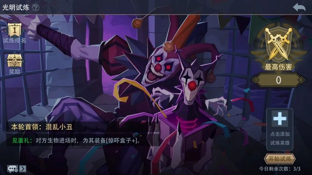 BOSS介绍:混乱小丑 技能介绍:见面礼 强化技能介绍(打掉150血后):混乱狂笑 Boss卡组介绍:(开局手牌有固有装备毒物喷射器,注意连锁闪电) 当日可选英雄: 英雄推荐:(1)铜锤萨满(最佳选择,我方生物回血会对对方任一生物造成相同数值的魔法伤害) 卡组思路推荐:三尾蝎成长流搭配蘑菇补血流(最佳组合搭配) 蘑菇补血流:(孢子+树妖+低语者+生命古树+治愈之风等)该常规打法一般可以拿满魔晶奖励