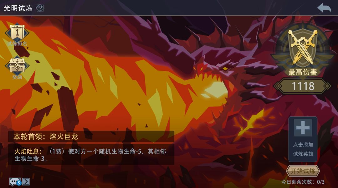BOSS介绍:熔火巨龙 技能介绍:火焰吐息 强化技能介绍(打掉150血后):火种 Boss卡组介绍:(开局手牌有原生装备,可以带张拆装备的,注意小红龙法伤和红龙直伤) 当日可选英雄: 英雄推荐:(1)晨曦仙灵(衍生物死亡进化) 卡组思路推荐:三尾蝎成长流搭配蘑菇补血流(最佳组合搭配) 蘑菇补血流:(孢子+树妖+低语者+生命古树+治愈之风等)该常规打法一般可以拿满魔晶奖励,2000分伤害打满需要的条