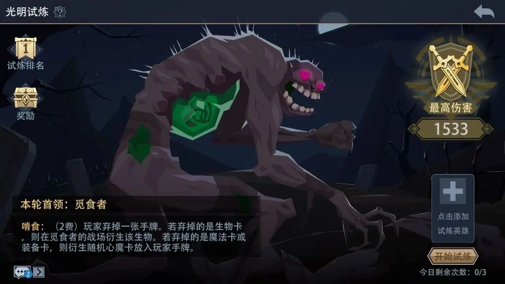 BOSS介绍:觅食者 技能介绍:如下图 强化技能介绍(打掉150血后):如下图 Boss卡组介绍:如下图(对方还有一个原生的香蕉法杖装备,注意对方龙人祭祀流衍生套路) 当日可选英雄: 英雄推荐: (1)怒鸮 卡组思路推荐:三尾蝎成长流搭配蘑菇补血流 蘑菇补血流:(孢子+树妖+低语者+生命古树+治愈之风等)该常规打法一般可以拿满魔晶奖励,2000分伤害打满需要的条件较高。 三尾蝎成长流:需要卡牌:魔