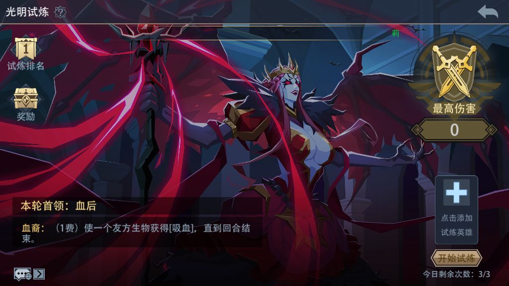 BOSS介绍:血后 技能介绍:如下图 强化技能介绍(打掉150血后):血之瘟疫 Boss卡组介绍:养高攻注意下6费的黑龙(随机消灭引雾兽等卡牌防御无效),另外该boss开局手牌存在一件固有装备,选卡时最好能打掉 当日可选英雄: 英雄推荐: (1)沸血狂猎 卡组思路推荐:秘法比蒙透骨流或三尾蝎成长流搭配蘑菇补血流 秘法比蒙透骨流:需要卡牌:秘法比蒙、月魂秘术(比蒙幼崽、比蒙等) 蘑菇补血流:(孢子+