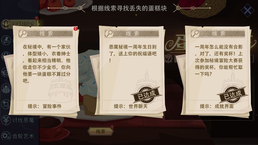 内容描述: 在秘境中,有一个家伙,体型矮小,衣着绅士,看起来相当精明。他收走你不少金币,你向他要一块蛋糕不算过分吧。 线索提示:冒险事件(蜂巢界面) 获取方式: 在冒险、梦魇模式进入蜂巢地图界面;再找到【地精商店】,“地精商人”头上会出现蛋糕块。 示例: