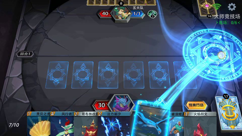 回合1: 抽卡; 使用拓印+选择奥数牵引+; 使用奥数牵引+选择对方2号位移至我方1号位; 使用英雄主动技能; 选择冥魂锁链装备给对方1号位; 上场火焰幻形师+至我方3号位选择对方1号位; 使用奥数牵引+选择对方1号位; 结束行动