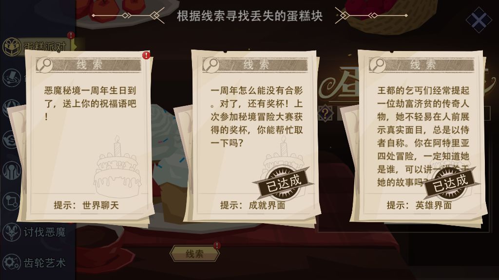 内容描述:恶魔秘境一周年生日到了,送上你的祝福语吧! 线索提示:世界聊天 获取方式:在【世界聊天】界面输入“恶魔秘境周年快乐”后,界面正中间会出现“蛋糕块” 示例: