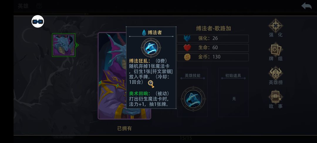 一、简介 二、技能 主动技能【缚法狂乱】 升级前:(1费)随机弃掉1张魔法卡(可能为衍生),衍生1张【符文禁锢】放入手牌(冷却1回合) 升级后:(0费)随机弃掉1张魔法卡(可能为衍生),衍生1张【符文禁锢】放入手牌(冷却1回合) 被动技能【奥术回响】 每当打出衍生魔法卡时,法力+1,抽1张牌 三、强化 强化6级 能提升衍生魔法卡效果,并降低费用 强化21级 配合强化26级能在第一回合就打出3费