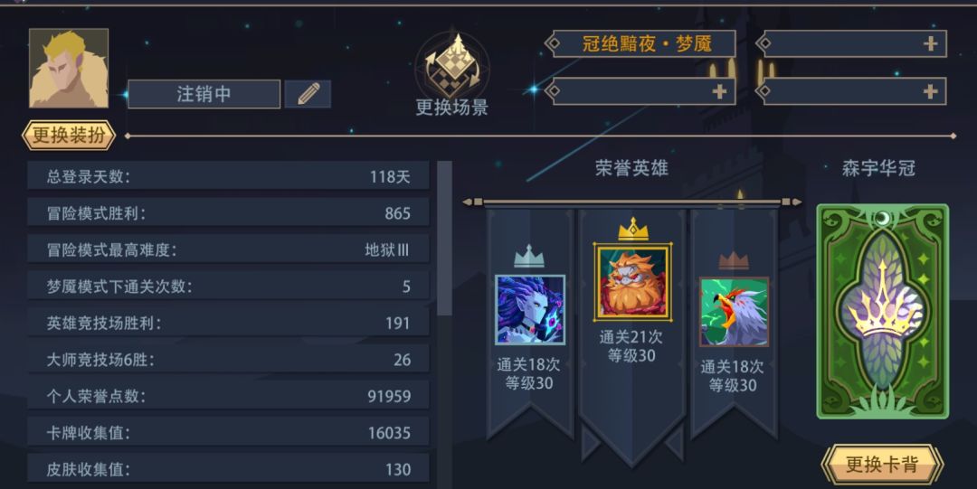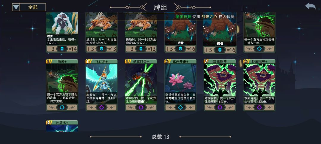 1.基础介绍 英雄:荒野变形者 体系:木 定位:黑塔速刷(周常+成就) 主动技能 召唤魔腾:在随机友方空位衍生1只暗藤(0费,冷却1回合) 被动技能 人形态:友方生物触发进场效果时,攻击随机对方单位;触发5次后,切换为熊形态,并重置主动技能。 初始卡组(共12张)下图红框部分为可删除卡 2.黑塔攻略 2.1开局准备 2.1.1卡背选择 T0(锤炼匠心>森宇>全知) 锤炼匠心 森宇华冠 全知之眼 T