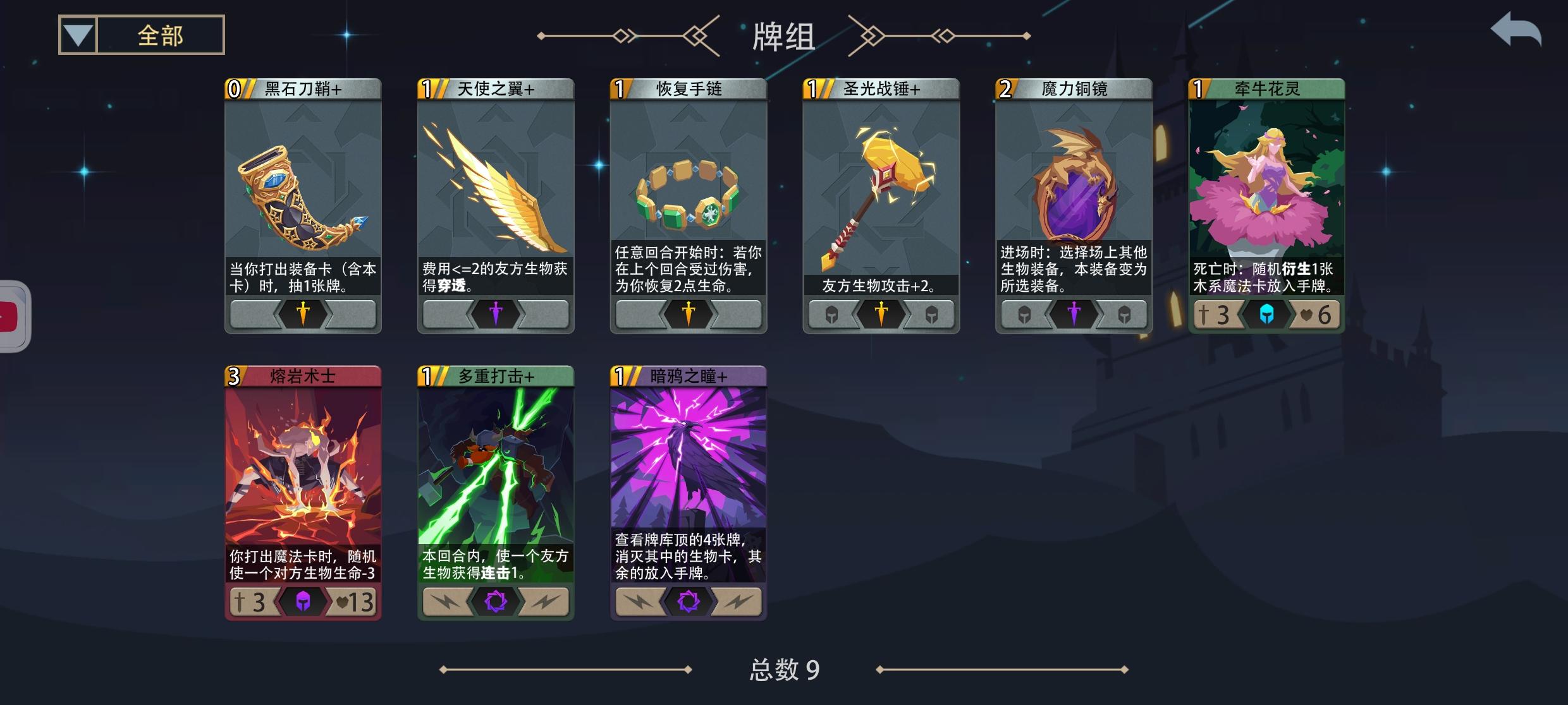 7太阳神鸟,无7比蒙,野兽低吼声7火凤凰,凤鸣7丛林赐福者,愿万物,皆得恩赐7光辉圣女,光辉之下,皆得守护7深海巨兽,咕噜声7战争古树,战歌不息,与我同命7边境骑士,以血换血,为生而战7贝螺女王,浪潮,涌起来7永夜女王,力量,屈从于永夜8黑骑士,败为终焉,死已如是8烈焰骑士,焚尽,踏碎8暗月海妖,来,加入我8知识古树,智得万物,唤为新生8大天使长,神裁众生,执吾为锋9