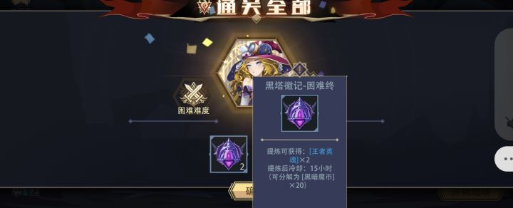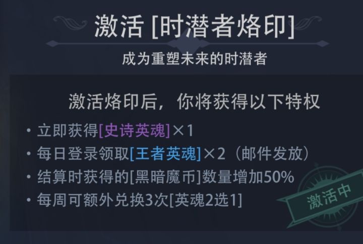 老咸鱼给自己找点上线的动力每周黑塔5次困难挑战和5次地狱挑战清完,留6个地狱徽记供提取紫魂外其他全分解,一周一共180*5+10*20+240*5+10*30-6*30=2420黑暗魔币收益 每周买完9次英魂+每天买1魂石,一周为900+160*7=2020 黑暗魔币消耗,能完全被满足激活烙印每天给2个蓝魂,黑塔每周能提取5个紫魂(每30h提取1个,向下取整)