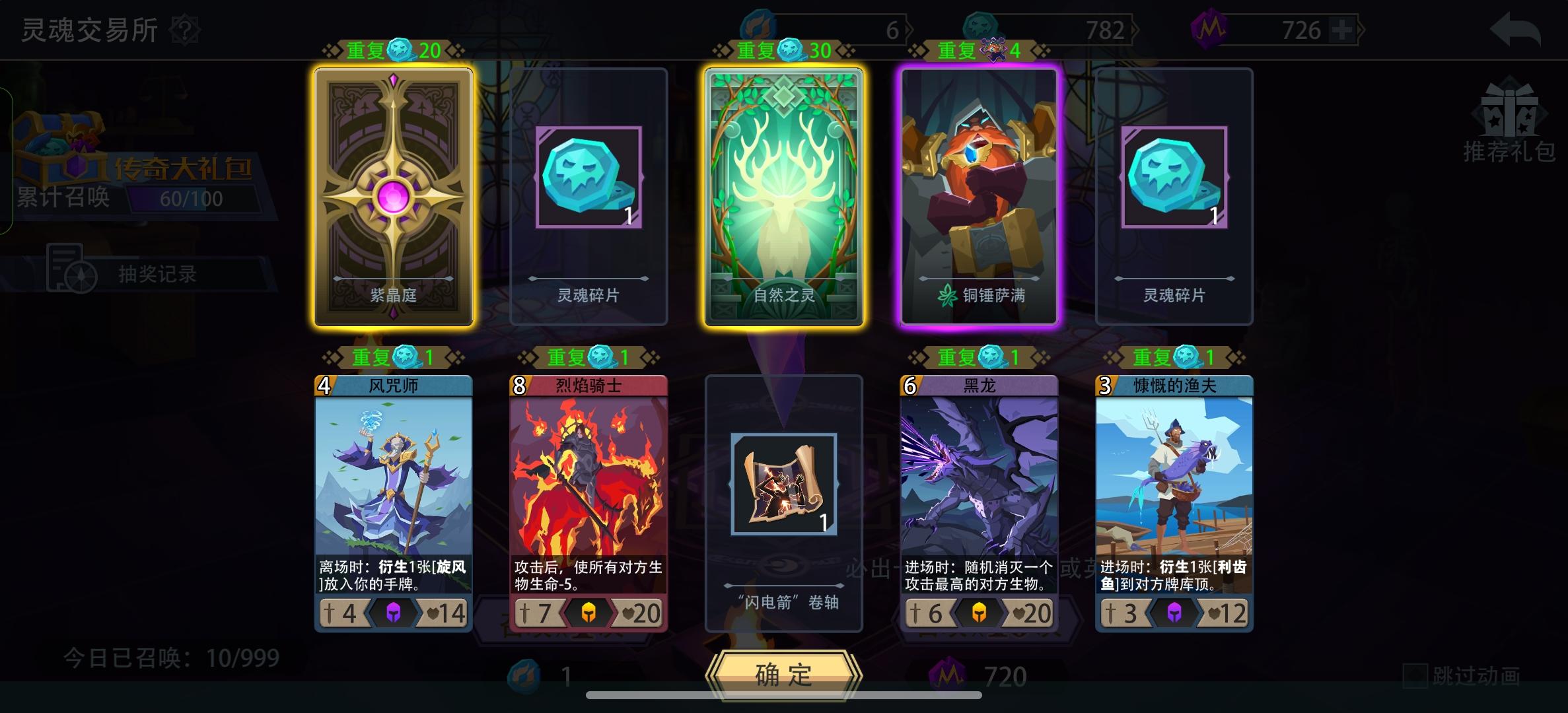 之前还差最后几个5级2紫魂神限,就佛了好久,上个月想着把黑塔场景拿了就顺便清清首通。星尊,第一把没懂机制,第二把拿到魔导手炮,低费就乱用,用不了就扔。稀里糊涂过了。虫妈,之前寄了几回,这把拿到拆弹专家、幻形师、巫毒烧瓶、巴赫种子、龙血瓶、复活甲,很胡,但是还是特别特别墨迹,我的血是满的,上限20,对面没手牌,一堆透支,照样要磨半天。魔王,之前也是寄了几回,这把拿到蜂群、军令牌➕征兵、占星幻影