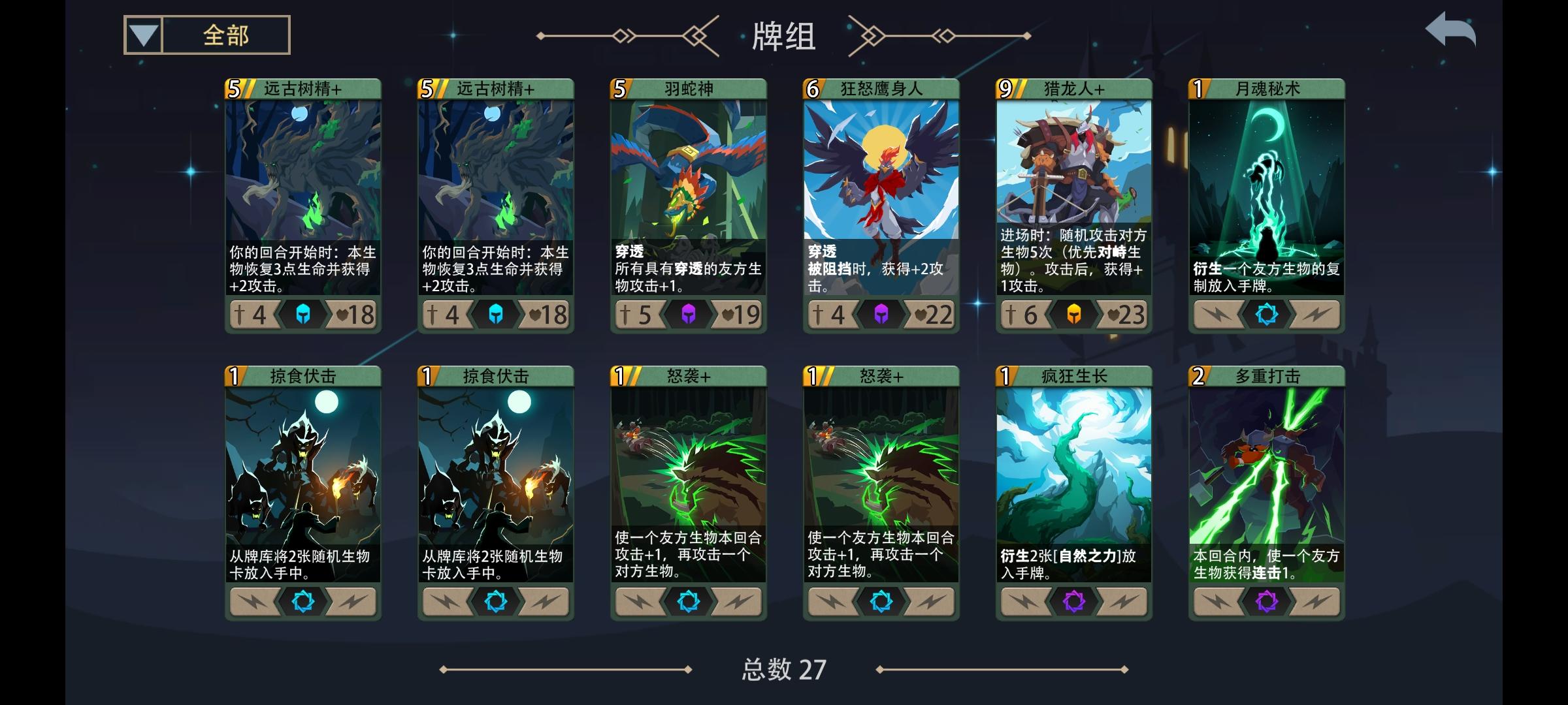 以下是我对森林女巫的思路,请大佬们点评给意见:魔法首选:兽王之怒越多越好,多重打击,1费的月魂秘术(复制大怪)+掠食伏击(从牌组中召唤大怪)+自然之力(可以过牌增加法力值),进化(将怪物提升2费并触发进场,可惜一直没拿到)生物:8费大树和牌组自带的树,9费猎龙人,7费比蒙(一直没遇到),生物卡组费用至少5费以上。启迪仙灵(提升2费触发进场效果,可惜一直没遇到7费的怪物卡)装备:哥布林号角(无