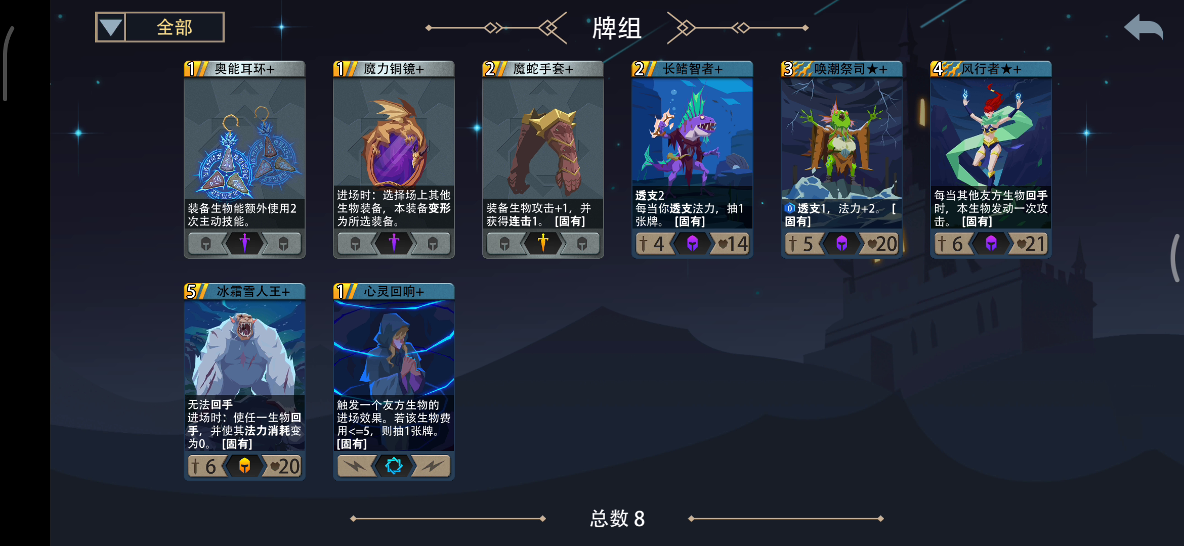 水系差不多的玩法,鱼人鱼个人感觉过渡啥的比其他水系玩的舒服,核心就是潮汐祭祀加耳环加蓝(铜镜复制一个)然后拉雪王回手祭祀再放入加蓝基本一次就行,另一个核心就是智者(透支一次抽一张牌,有宠物项圈可以直接拉上场,没有就多拿一种心灵回想)输出牌是风行者配合雪王回血可以无限输出,然后鱼上鱼技能加攻击力我就带了连击也有铜镜可以复制。(虽然我用的是30级的但是这套阵容1级也可以👀)