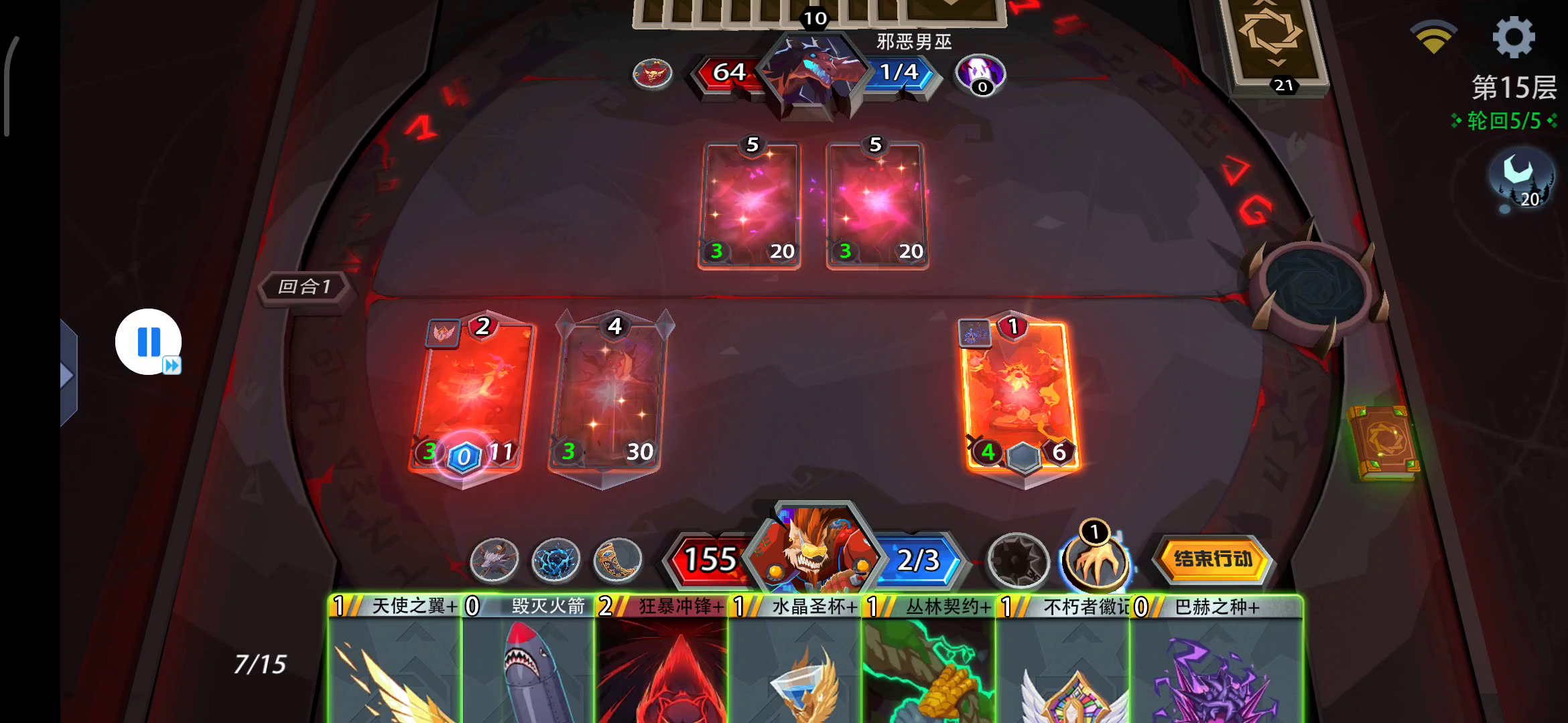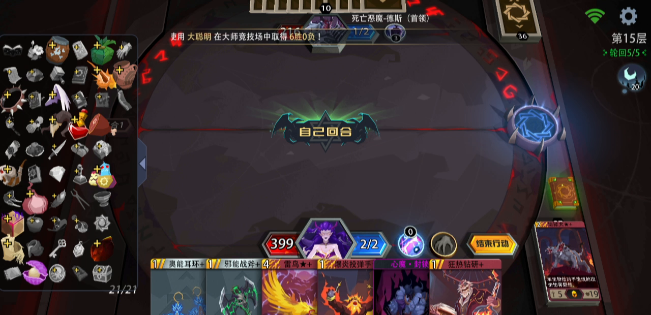 牌组:2张噬咒幻兽,一邪能战斧,一魔蛇手套,一黑暗秘典,一咒怨魔杖,以及尽可能多的心魔卡。 道具:飞马之翼(必选,有狂暴冲锋或哥布林号角的可不选),秘术魔盒(强烈推荐),巫蛊号角(强烈推荐)。 前期道具推荐:巫法笔记,附魔宝石,诡异盒子,尘封的包裹,古怪金币,储藏腰带。 等级:16级以上即可。 由于我选了火药桶和弹弓,导致第一回合的准备时刻把boss打出第二形态了,没能在一回合之内搞定。