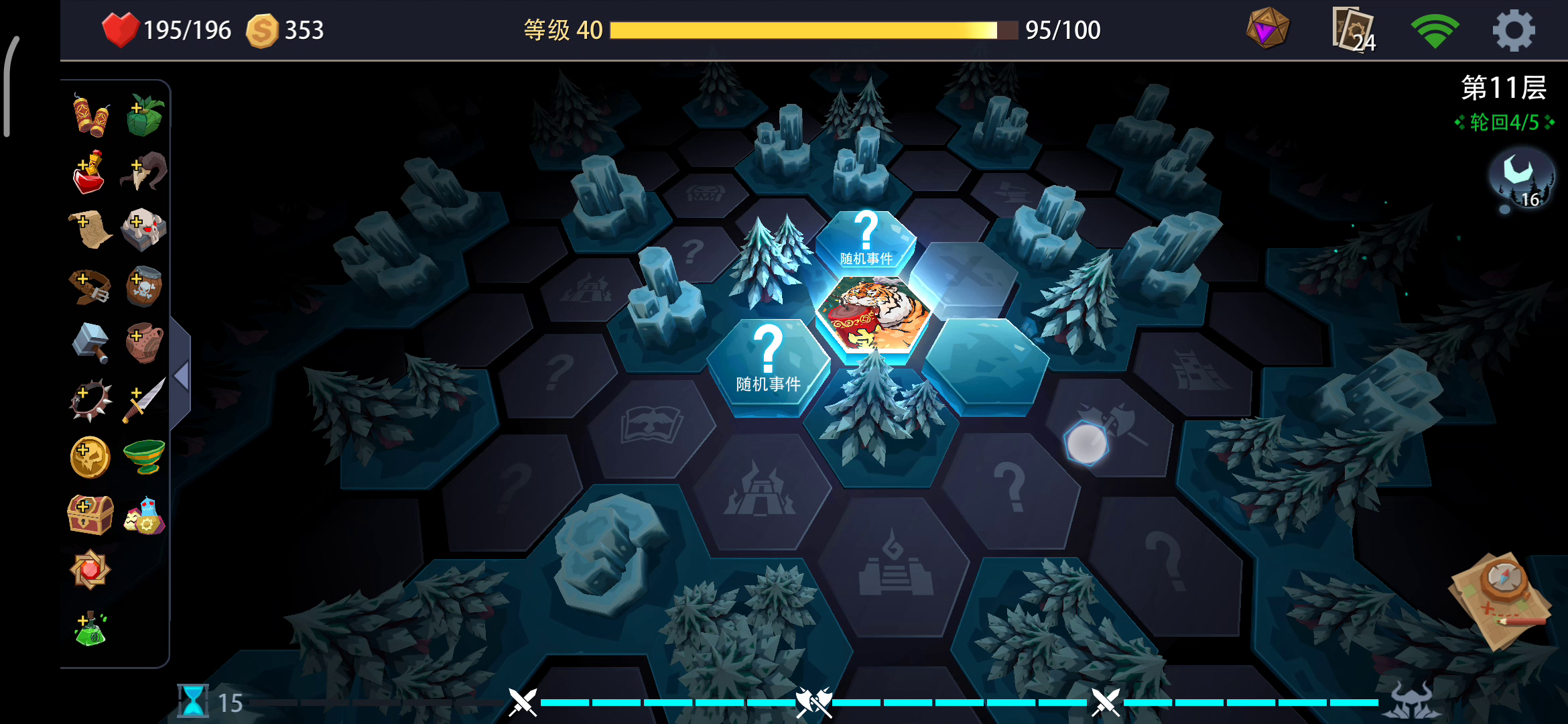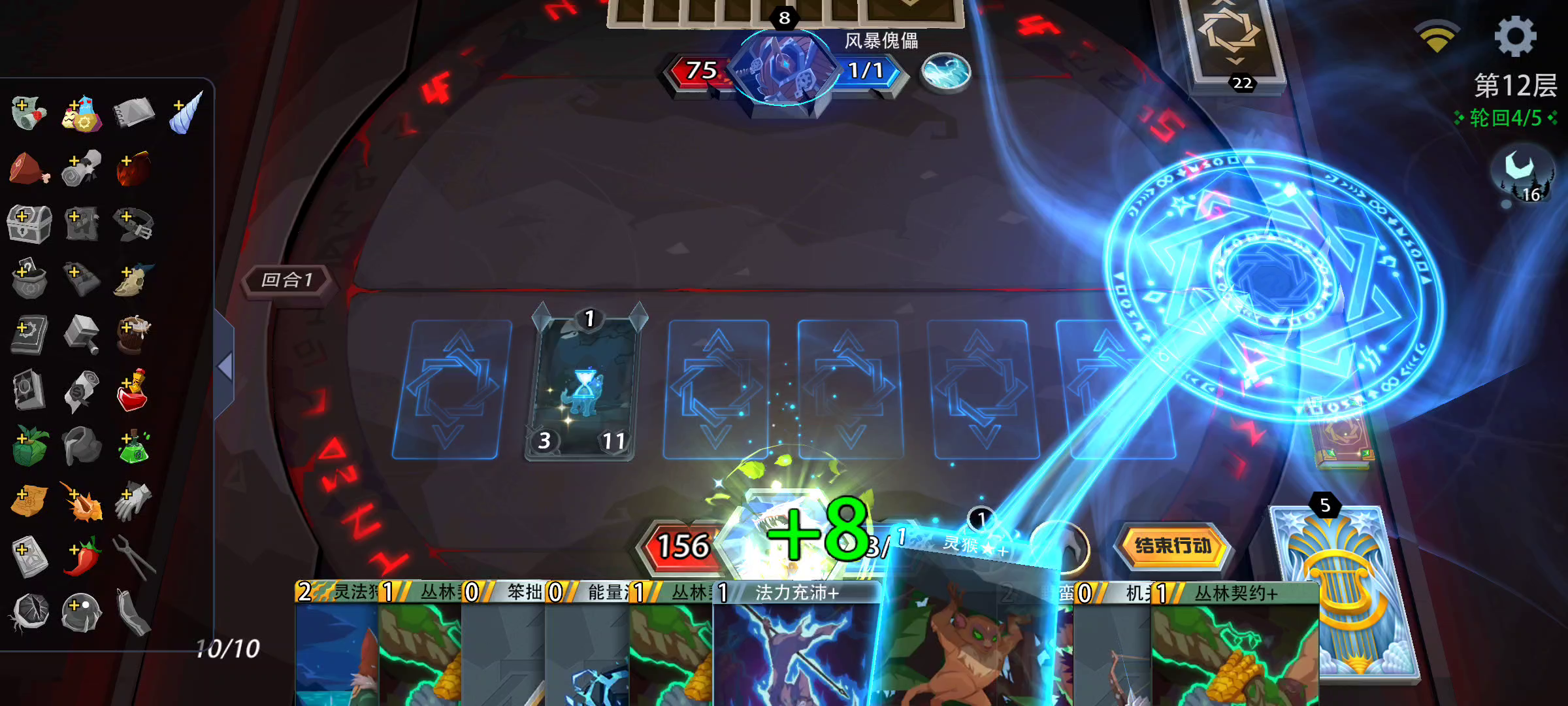 前几层找道具手牌上限加6那个,固有2张雷鸟一张斧头,没有套娃的话在固有一个手套,有火石剃骨刀炸药桶很快,这把开局就拿到了手牌上限,成型之后一直走空格基本一小时左右15层。