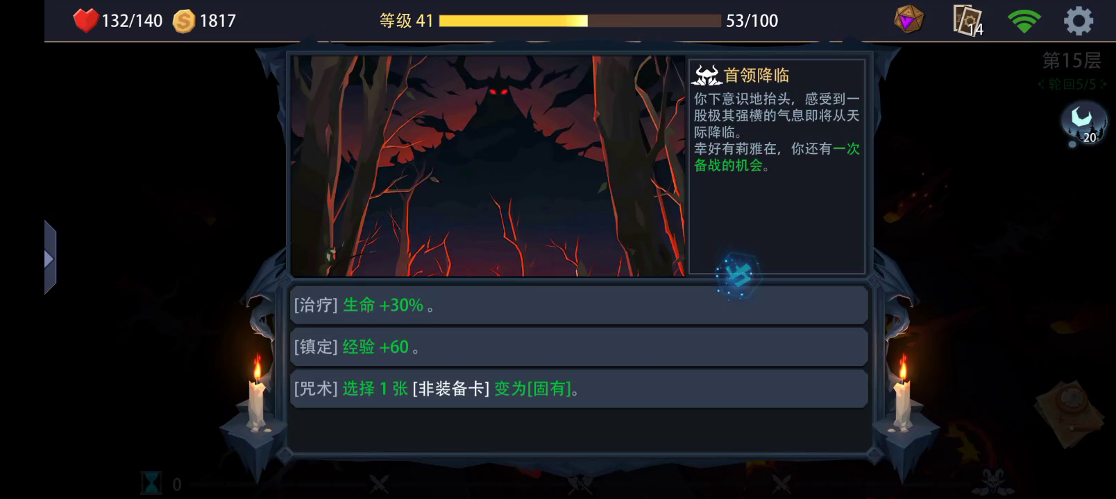 真正的不用打牌 全自动秒怪 除了boss不能秒杀 要打一轮牌以外 其他小怪照面就死。 输出主要是考三个道具 一个是减一滴血扣boss20百分比伤害 加上剔骨刀对小怪和精英怪30百分比伤害 再加上心魔卡——8加心魔卡数量的伤害达成秒杀