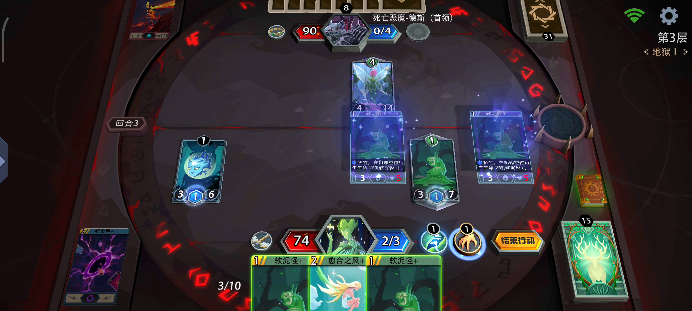 风灵加软泥真的好快乐,我就固有了这两张牌。然后我发现我基本上用不到别的牌了。疯狂刷就完了 不过我牌组里一共三张软泥,还有月魂,遇见血量高的,也可以抗压,血量低的一个软泥刷完血量,基本boss也就没了 中途技能还放早了,浪费了不少伤害,不过问题不大。