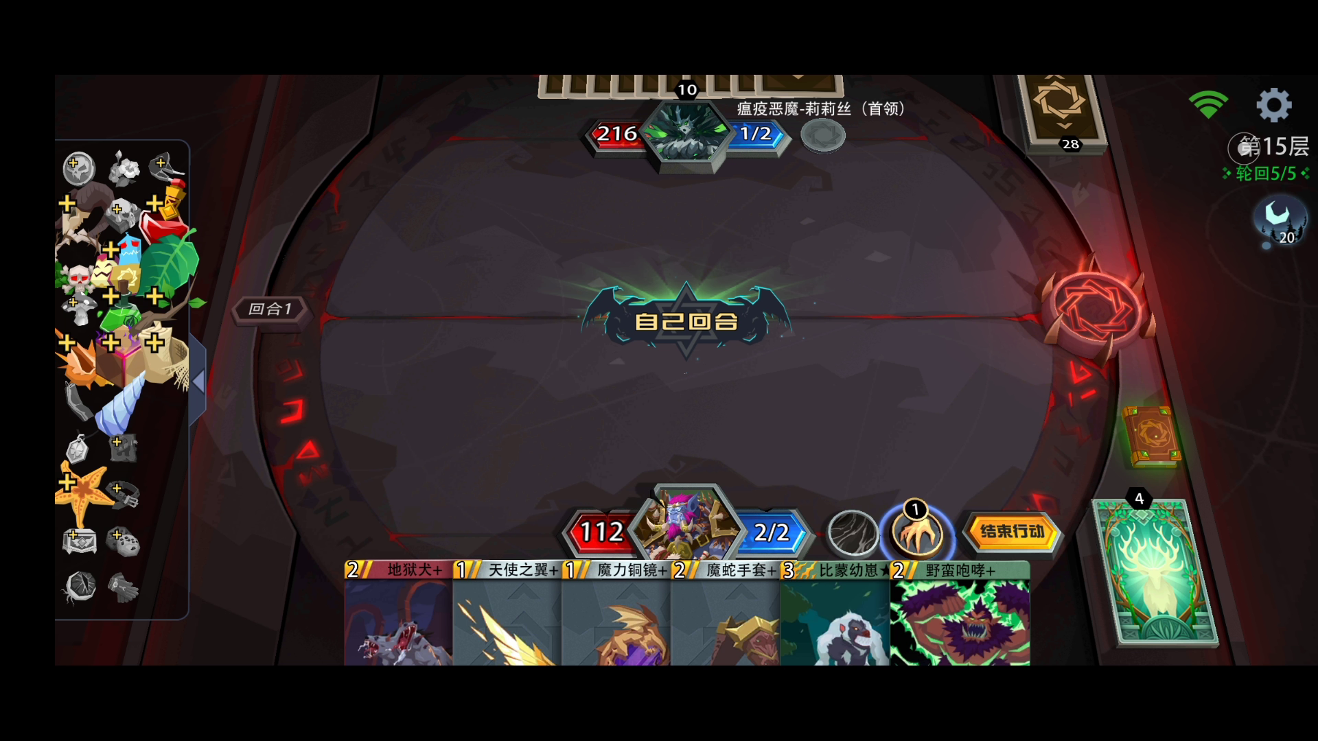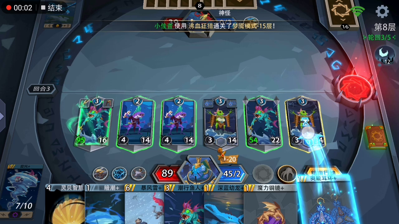 key牌:比蒙幼崽,地狱犬或者螳螂,地狱犬得靠冒险者箱子。一般怪普通boss都是三回合,5层中级boss5回合。一定要两个生物牌,第一张生物被回手可以再出张。