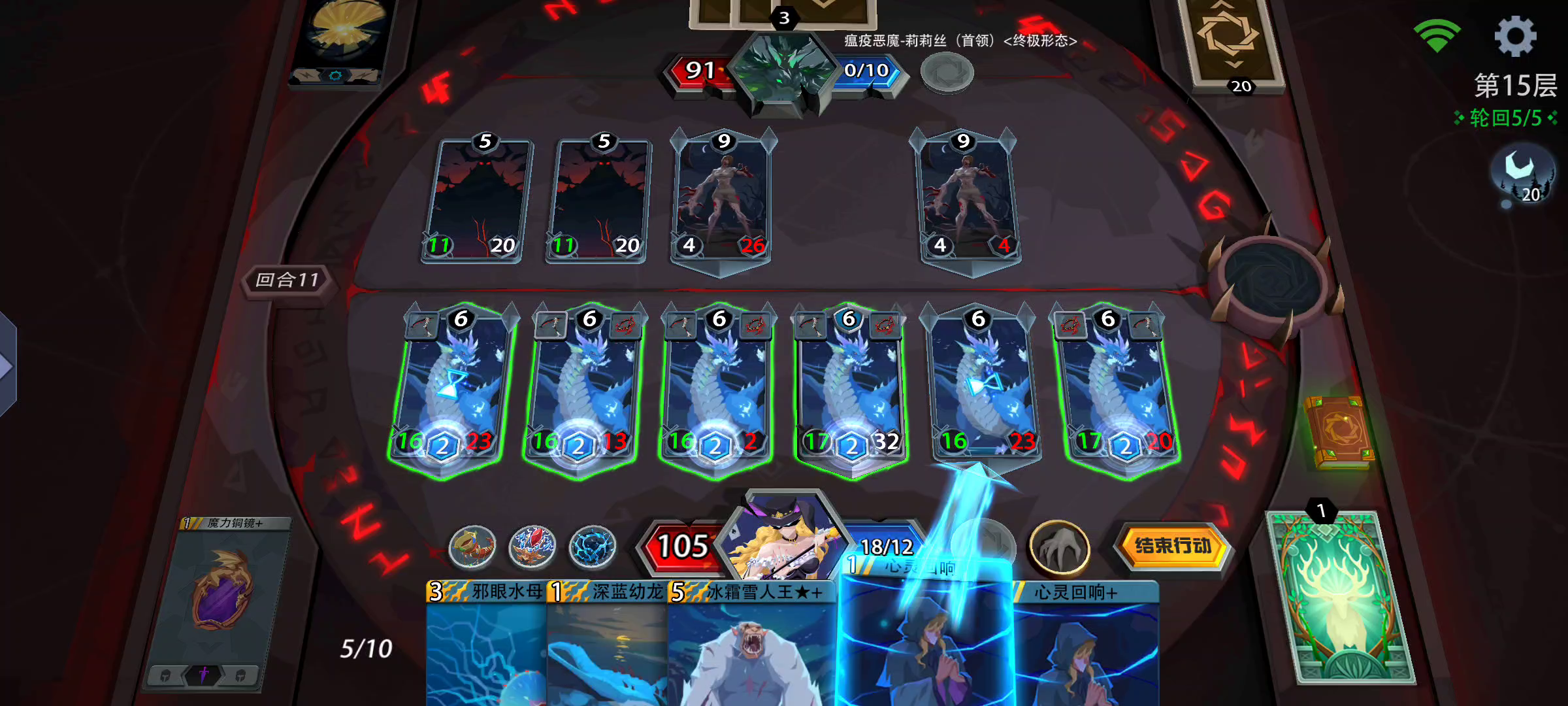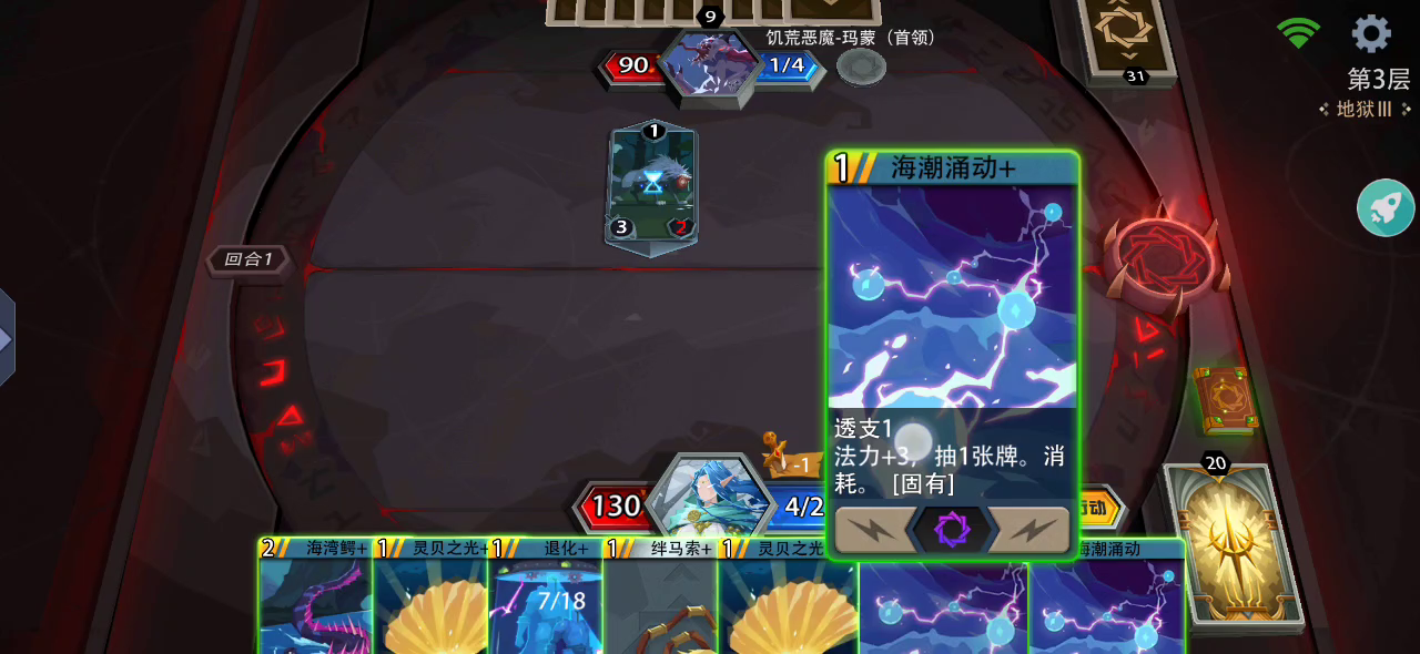 因为要打榜,所以全在找怪打,手里很多杂牌,导致第一波的海潮没用上,这只是一种打法,我没说它很强,更没说无敌,仅供参考,不要骂我了。 核心 一个祭祀,一个鱼人 ,一个智者(用于道具,固定二费卡),其他就是海潮和旋风,还有一些装备