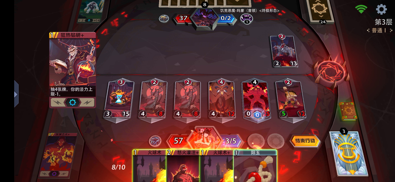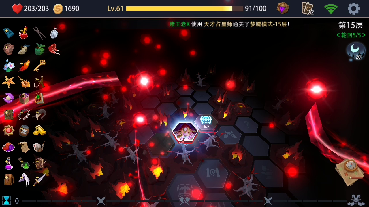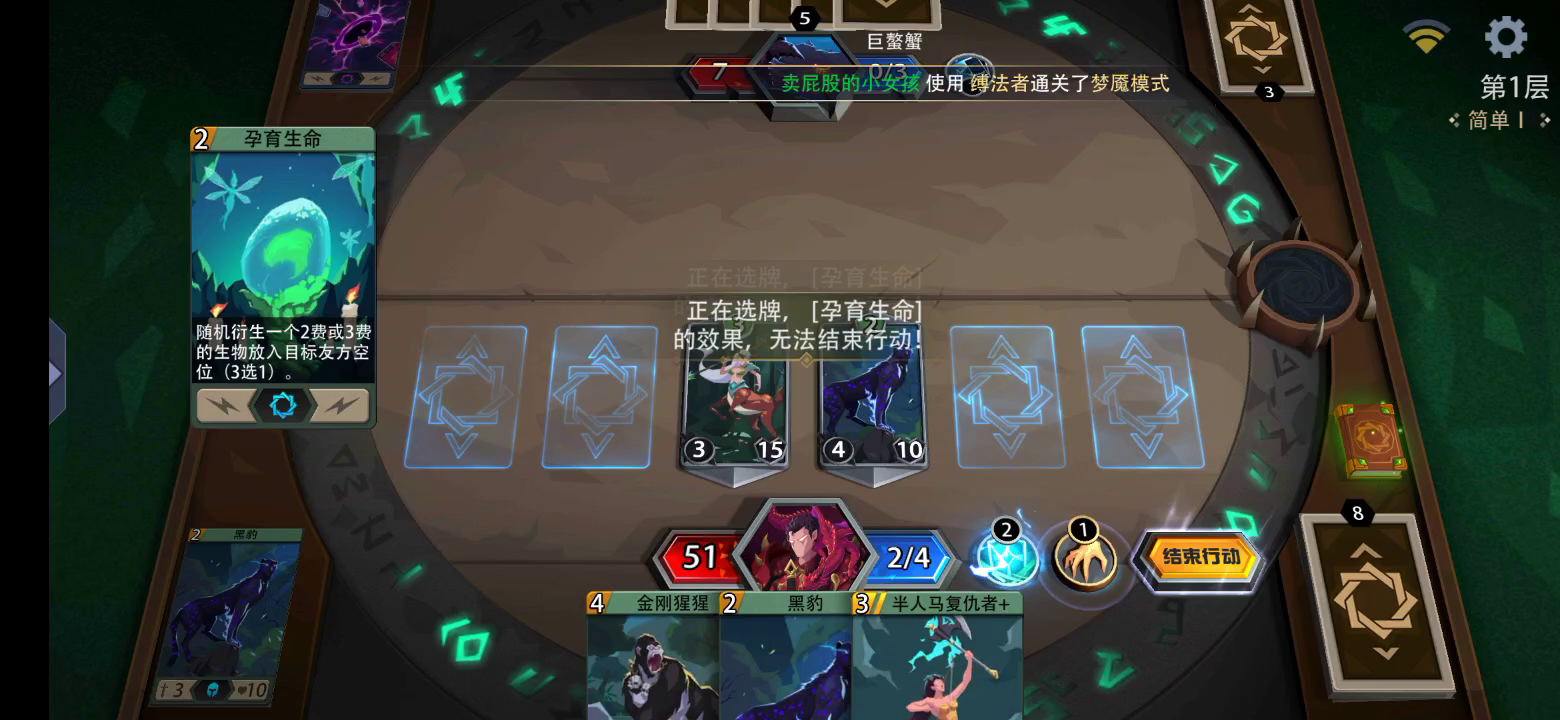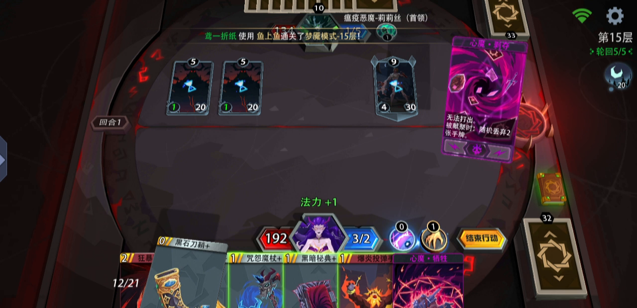 大概了解了炸弹人怎么玩之后就去打了一把梦魇,成型后一回合带走,没有再刷伤害是因为祭祀技能炸一下后直接保护了,我还发现固化不能超过初始摸牌量,不然会在所有的固化牌中随机拿😁