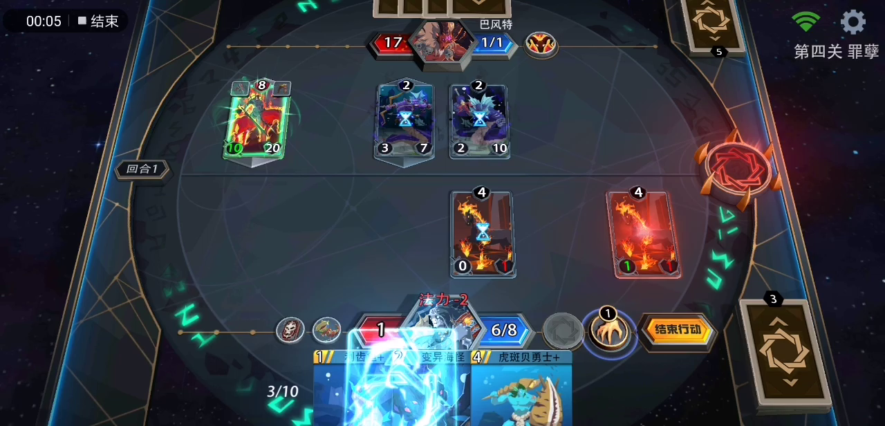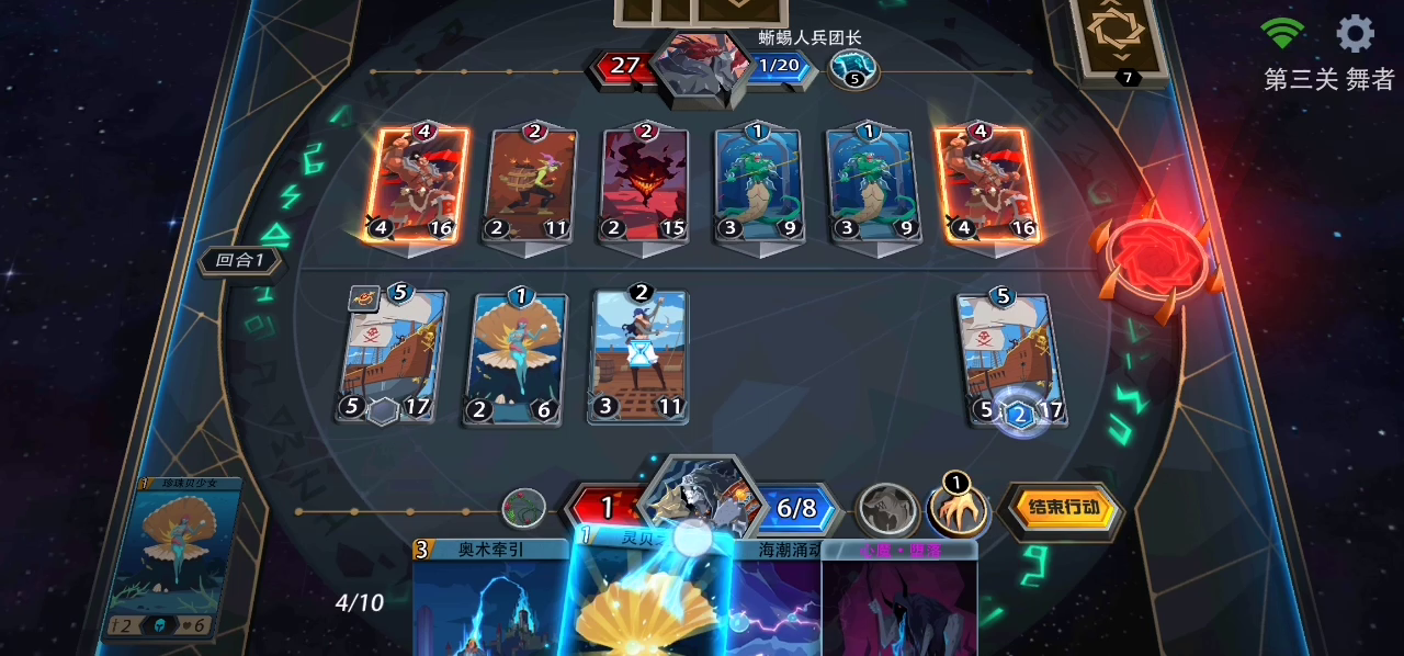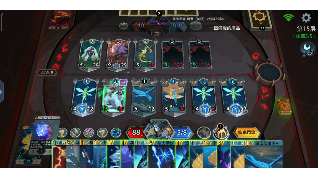 核心组件小蓝龙,法力充沛,秘法套娃 原谅我眼神不好没看到魔法幻象所以在后面做了些无谓的操作😂 这是第四次轮回,第五次同理多操作一会把另一个5费怪拉上去就好